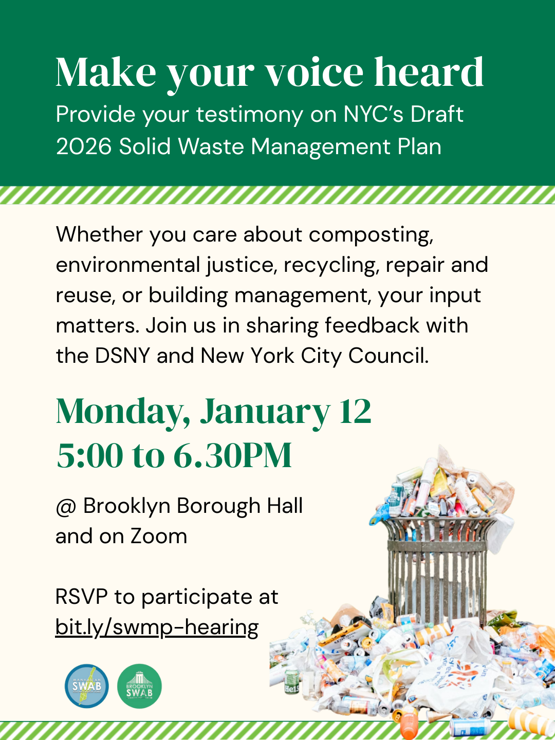 The Brooklyn and Manhattan Solid Waste Advisory Boards held a public hearing on Monday, January 12th at Brooklyn Borough Hall to collect community perspectives on the Draft 2026 SWMP. The SWABs collected 36 comments with an additional 50+ attendees.